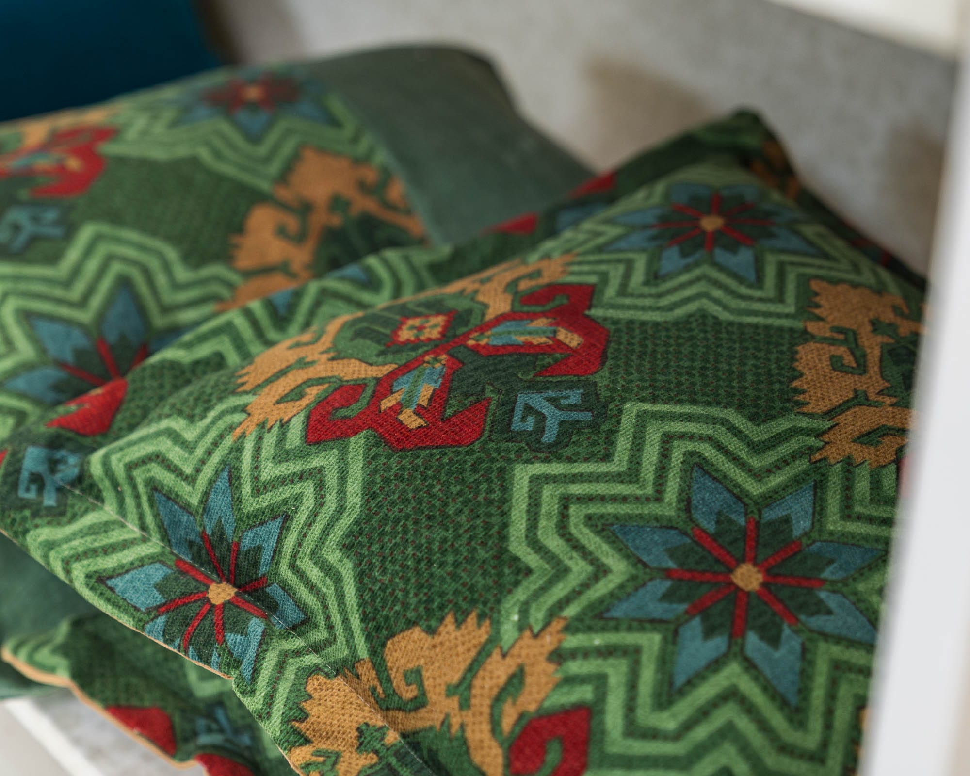 The French Voltaire chair has been revived using striking apple green velvet, making it an eye-catching addition to any space. To complement the chair, a range of apple green velvet cushions are also available, providing both elegance and comfort.
